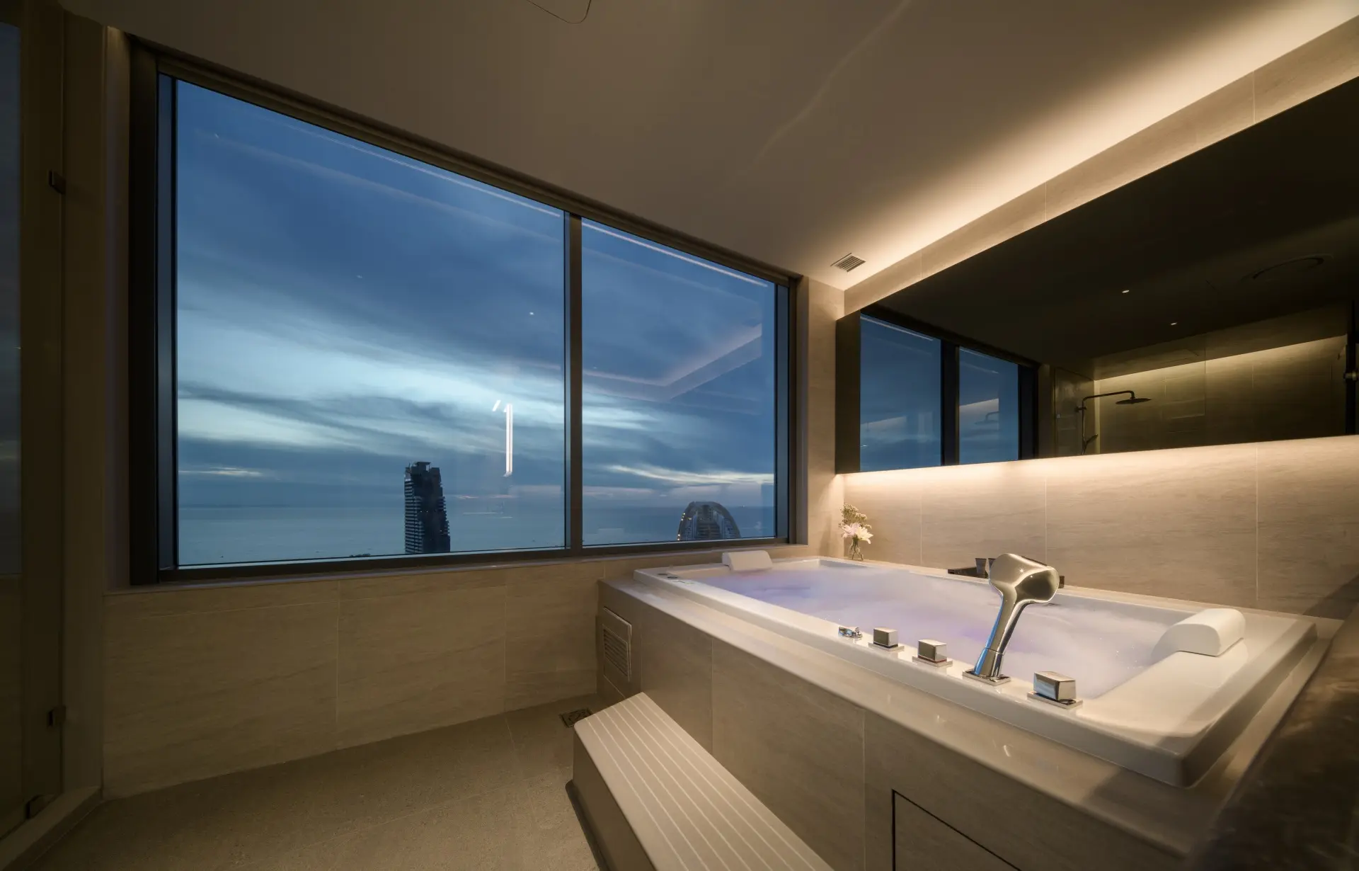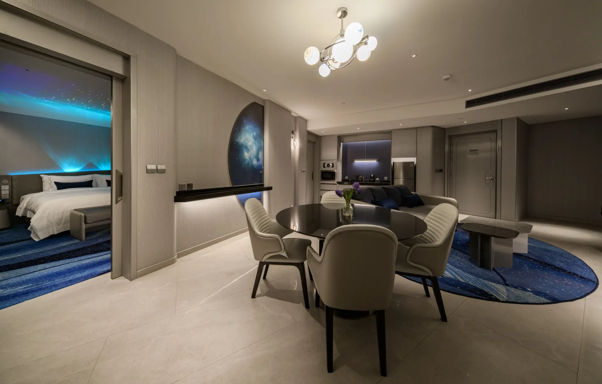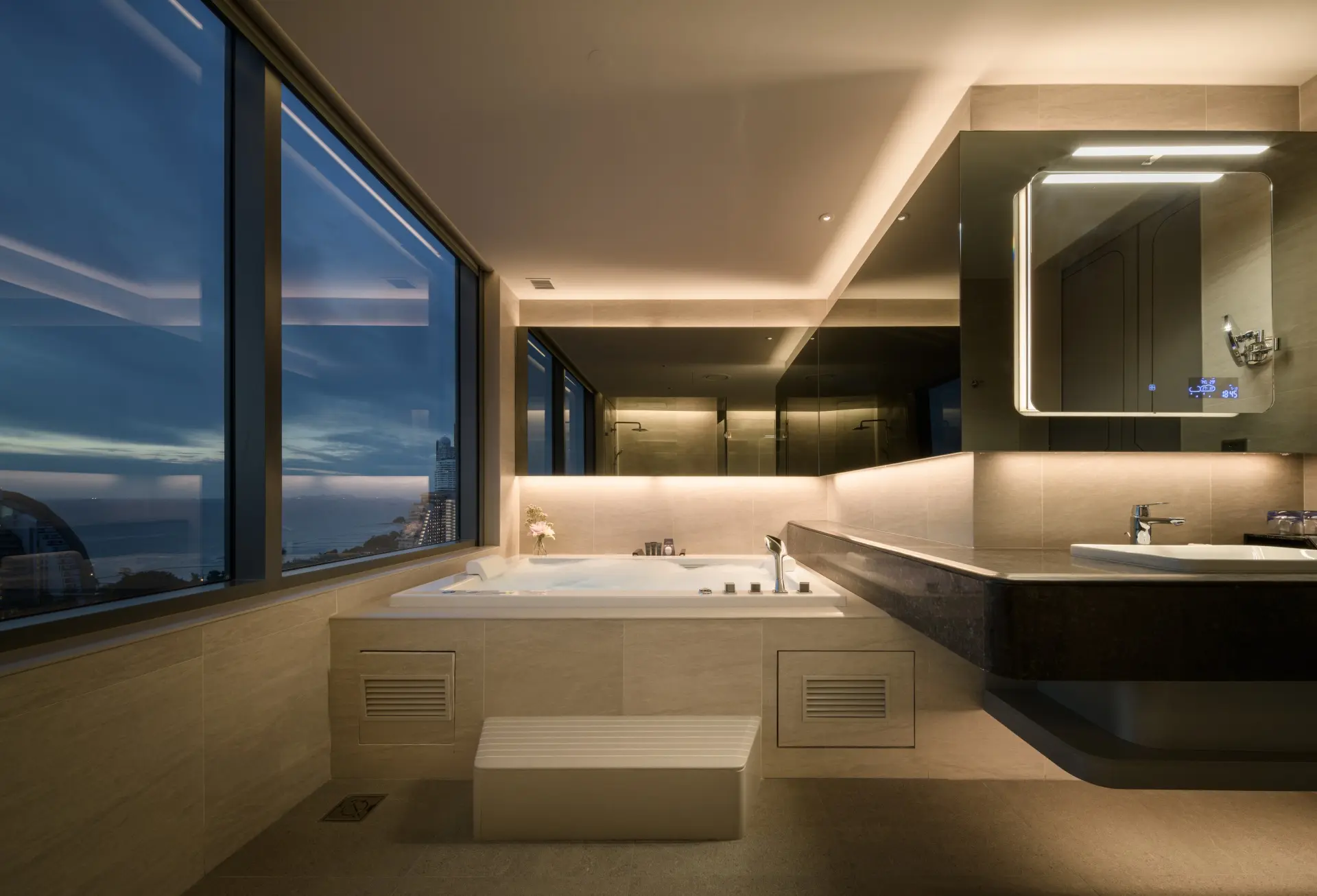 The Space Suite, with 88 square meters and two large internal rooms, as well as a private balcony, is the next level up. A bedroom with stargazing and aurora borealis lighting connects to a separate living room, completely equipped with a sitting area with 65" flat television, harman kardon bluetooth, dining table for four, and mini bar with refrigerator and microwave. The en-suite bathroom has a rain shower and a large jacuzzi with views of the ocean and natural light from AM to PM.