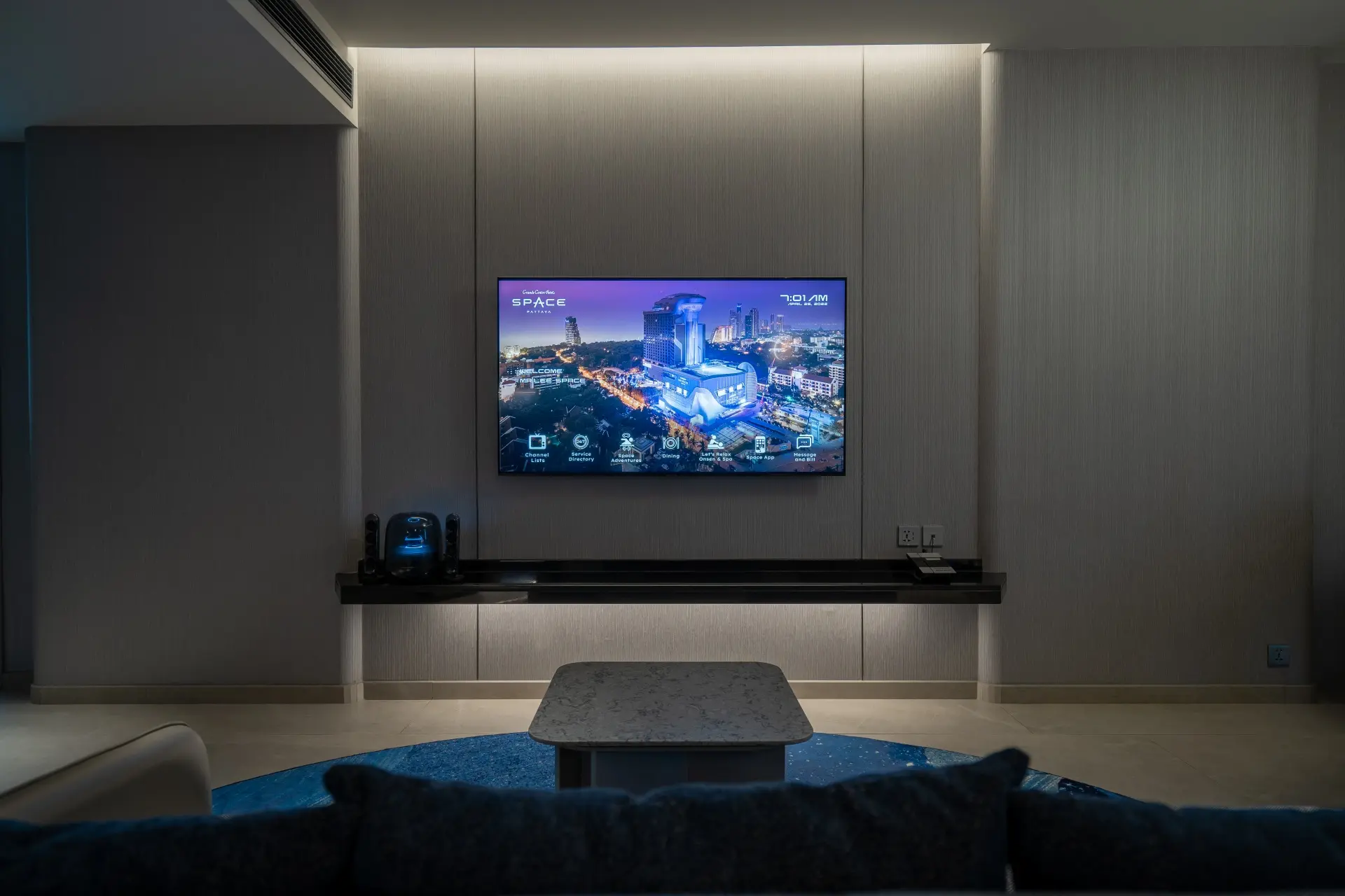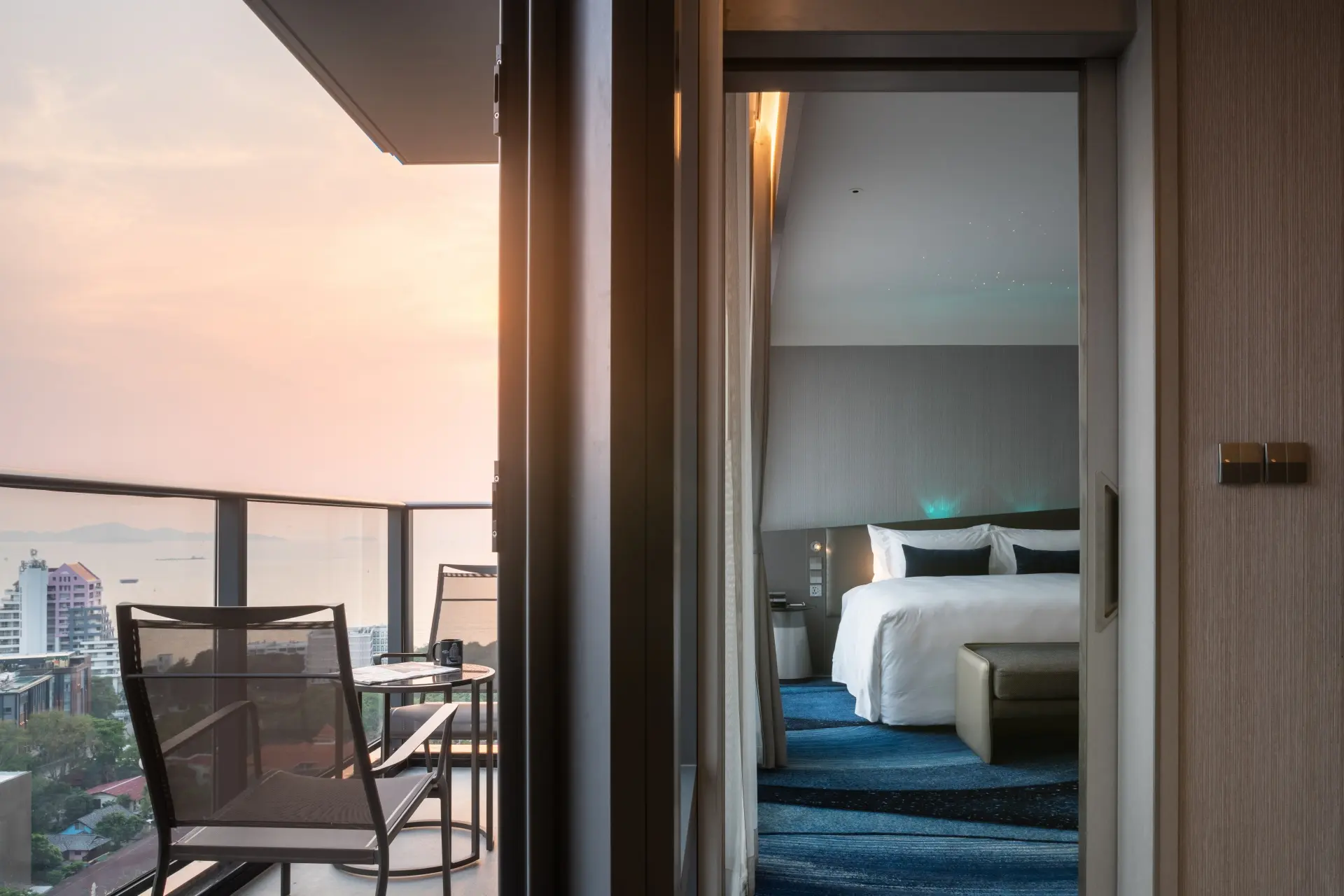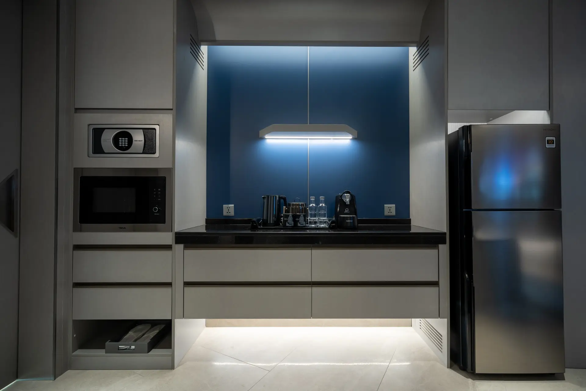 The Space Suite, with 88 square meters and two large internal rooms, as well as a private balcony, is the next level up. A bedroom with stargazing and aurora borealis lighting connects to a separate living room, completely equipped with a sitting area with 65" flat television, harman kardon bluetooth, dining table for four, and mini bar with refrigerator and microwave. The en-suite bathroom has a rain shower and a large jacuzzi with views of the ocean and natural light from AM to PM.
