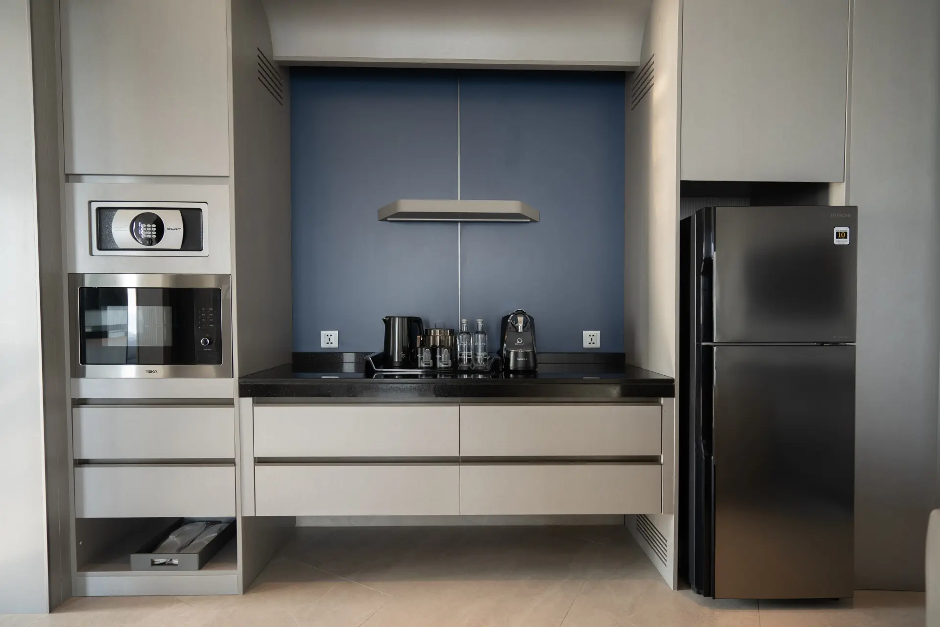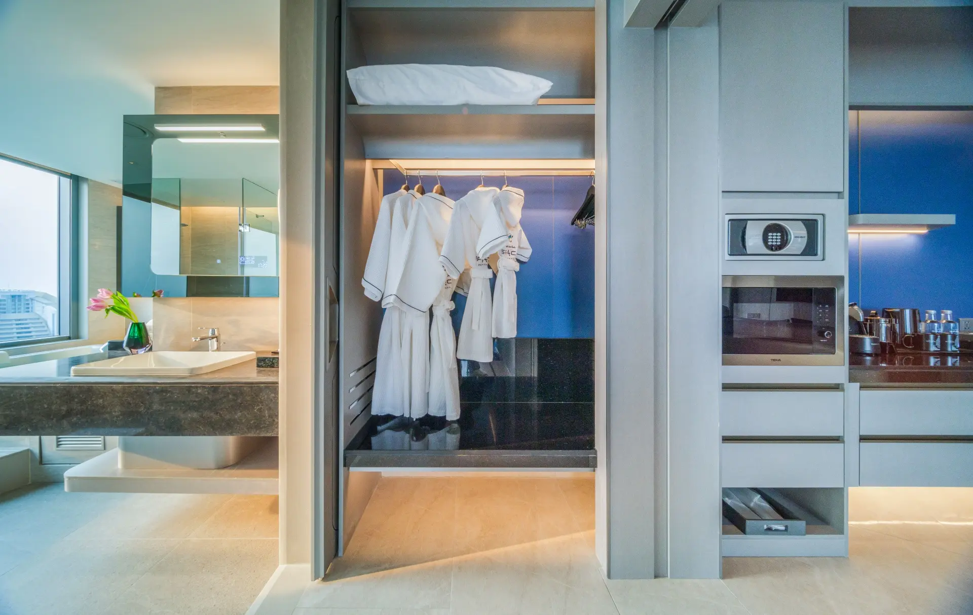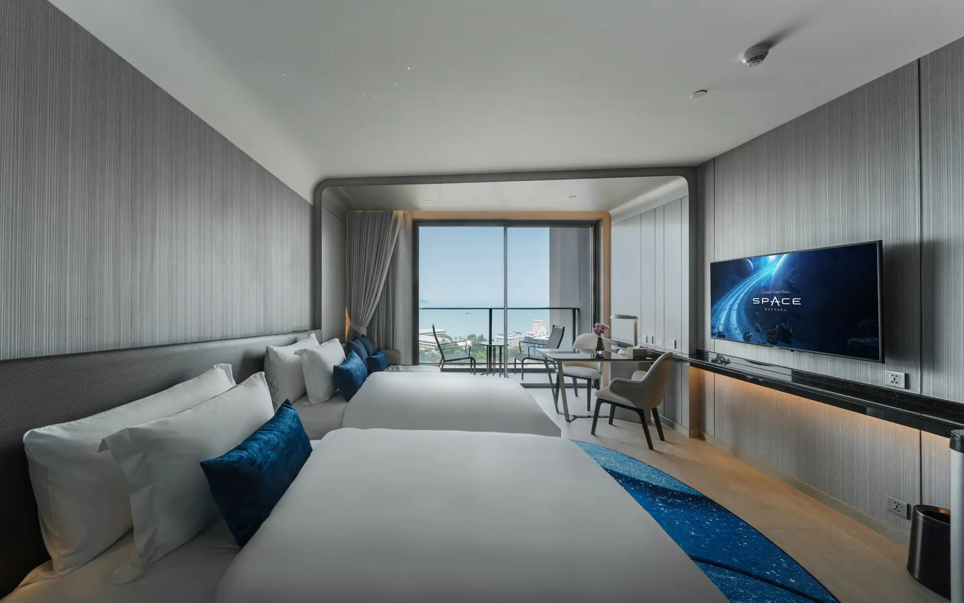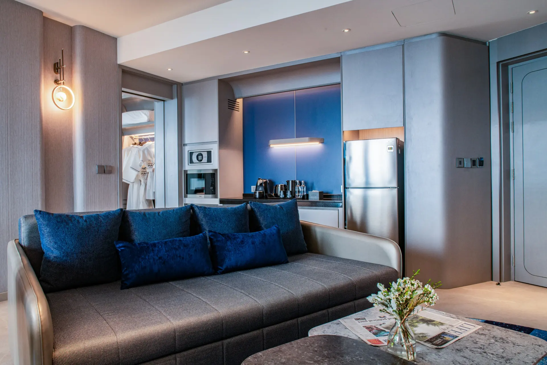 พื้นที่นั่งเล่นที่แยกจากห้องอื่นมีทีวีหน้าจอ 65 นิ้ว ลำโพงบลูทูธของ Harman Kardon โซฟา โต๊ะรับประทานอาหารสำหรับสี่คน ตู้เย็น เครื่องชงกาแฟแบบแคปซูล และตู้ไมโครเวฟ ทำให้สเปซสวีทคอนเน็กซ์เหมาะสำหรับการเข้าพักแบบครอบครัว ห้องนอนทั้งสองห้องมีแสงเหนือ ระเบียงที่มองเห็นวิวทะเล ตู้เสื้อผ้า และห้องน้ำสองห้อง โดยห้องน้ำของห้องนอนหลักมีอ่างจากุซซี่ในตัวพร้อมห้องอาบน้ำฝักบัวแบบเรนชาวเวอร์ และห้องนอนเชื่อมมีห้องน้ำขนาดกว้างขวาง